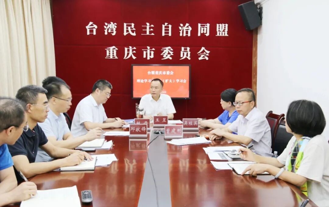 2024年7月23日,台盟重庆市委会召开理论学习中心组(扩大)学习会,传达学习贯彻中共二十届三中全会精神。重庆市政协副主席、台盟重庆市委会主委王昱主持会议并讲话。台盟重庆市委会副主委吴桂英、邱献锋、林丹,副秘书长、二级巡视员曾建刚出席会议,台盟重庆市委会全体机关干部和重庆两岸经济研究所同志参加学习。