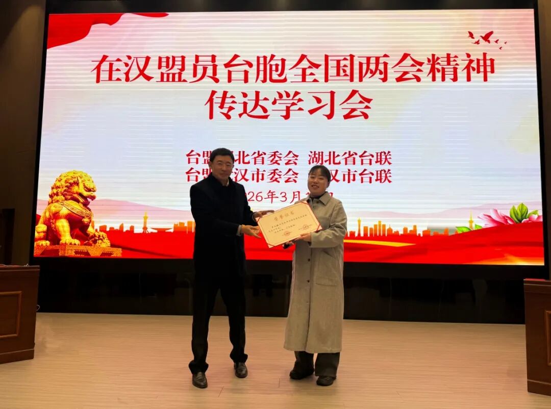 会议表彰湖北省统战系统先进工作者,刘江东为获得全省统战系统先进工作者的盟员罗文嬿颁发荣誉证书