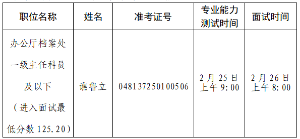 因办公厅档案处一级主任科员及以下职位有考生放弃面试资格,根据公务员考录有关规定,在公共科目笔试合格的考生中,按照笔试成绩从高到低的顺序进行递补,递补以下考生为面试人选(按准考证号排列):