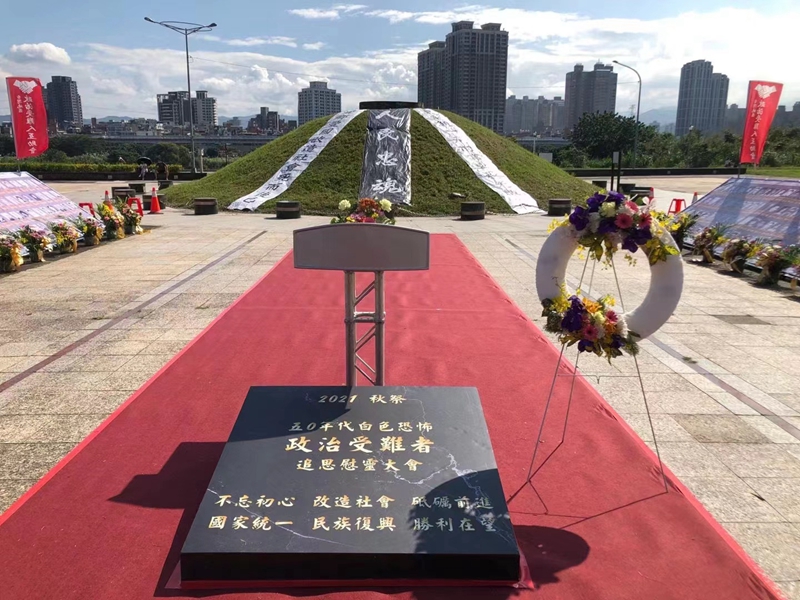 秋祭现场庄重肃穆,台湾地区五〇年代白色恐怖政治受难者牺牲处的土丘上,印有“人民忠魂”大字的黑色绸带和写有“爱乡爱国改造社会死而后已,民主统一走向富强承先启后”大字的巨幅白色挽联,覆盖于上。土丘前的两侧,写有“台湾地区政治受难人互助会”的红色旗阵迎风招展,旗帜下是白色恐怖时期牺牲烈士和已经去世的受难者遗照,遗照前摆满鲜花。