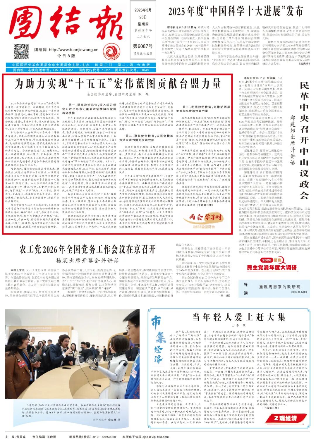 今年是台盟“高质量发展提升年”,全盟要以学习贯彻全国两会精神为动力,扎实做好全年各项履职工作。要按照政府工作报告要求和“十五五”规划决策部署,在建设现代化产业体系、因地制宜发展新质生产力、建设强大国内市场方面深化研究,在推动经济持续健康发展和社会全面进步、扎实推进全体人民共同富裕、推进海洋能源资源开发利用等领域加强调研,多措并举推动成果转化,提高建言质量。要对标“十五五”规划“扎实推进乡村全面振兴”部署要求,彰显“台”字特色,立足台盟帮扶赫章20周年新起点深化社会帮扶,开展黄河流域生态保护和高质量发展专项民主监督工作,在多党合作事业中充分展现台盟增进民生福祉的新担当新作为。