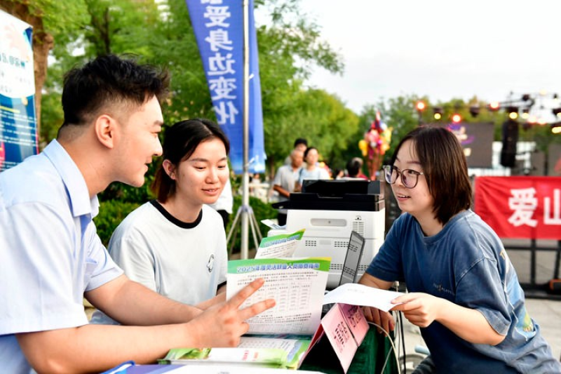2025年8月25日,在山东省滨州市惠民县孙武广场,人社局的工作人员向市民介绍社保证明查询相关服务。新华社记者 郭绪雷 摄